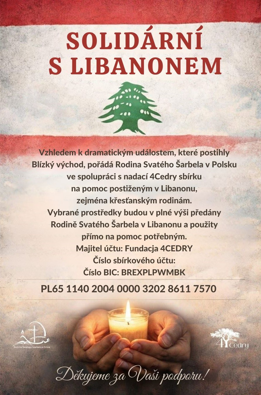 - Po mší sv. – moderována adorace. Před adorací budou přečtené vaše díky směřované k Bohu. Adorace bude zaměřená jako modlitba k našemu vnitřnímu uzdravení. Ukončení programu se předpokládá před 19 hod. Během celého programu bude možné přispět do sbírky, která je určena trpícím křesťanům v Libanonu během současného válečného stavu v této zemi. Podrobnosti jsou uvedeny na plakátu. Pro délku programu, ve vhodnou chvíli (např. během pomazání olejem sv. Šarbela, během udílení svátostí pomazání nemocných, během sv. přijímání, apd.), se postavit, nebo si vyjít z lavice, např. před kostel. Během programu je vám k dispozici služba u vchodu do kostela. Toalety Toi-Toi jsou v zadní části parkoviště.